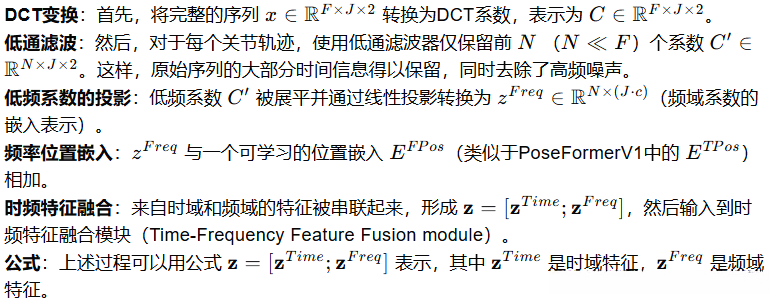 V2设计了一个时间-频率特征融合模块,该模块结合了时域中的特征(来自少数中心帧的空间Transformer编码器)和频域中的特征(来自完整序列的低频DCT系数)。这种融合方法使得模型能够同时利用局部的精细动作信息和全局的序列信息。