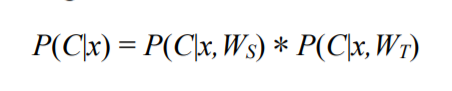 在决策过程中,在针对每个网络参数的两个版本WS和WT中分别生成类成员属性概率分布(P(C|x, WS) 和 P(C|x, WT)),这些分布代表了给定动作观察x属于类别C的概率值。通过逐元素相乘的方式结合来自两个神经网络的信息来源,在此过程中实现了更加高效的分类判断。