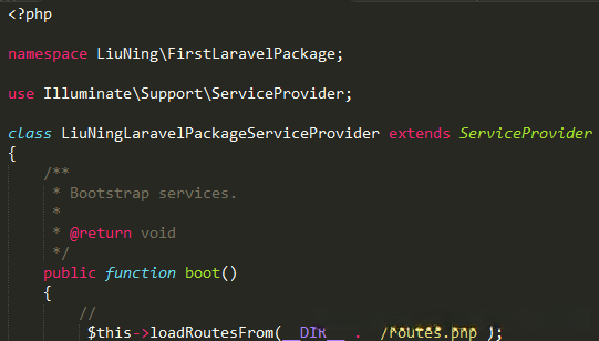 此时的应用容器仍然使用 namespace App\Providers; 将其更改为 namespace LiuNing\FirstLaravelPackage; ,该命名空间采用 vendor/package_name 的结构即为 composer 系统自动配置的命名空间。无需对其他部分进行修改。
