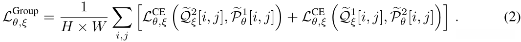 强制不同视图的 空间对齐像素之间 分配分数的一致性。交叉熵损失 在所有空间位置上 进行平均 以产生分组损失 :