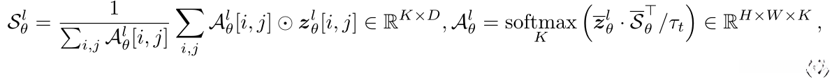 • 语义分组 被表述为 特征空间像素级的深度聚类问题 ,其中 聚类中心 被初始化为 数据集共享的一组可学习语义原型 ,并且通过 将像素分配给 聚类 来实现分组 。然后可以通过将像素软分配到聚类中心 并 以 加权的方式 聚合它们的特征 以形成新的特征(也称为槽 Slots )来为每个样本更新聚类中心 。
