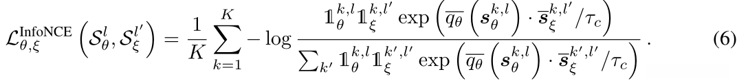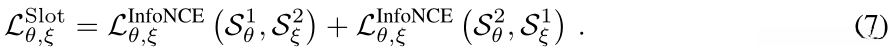 的计算方法类似。根据 对象级 SSL [59, 31, 68, 32] 中的文献,本文然后应用 对比学习目标 用 InfoNCE 损失 来 区分 具有相同语义的插槽 与 分散注意力的插槽 :