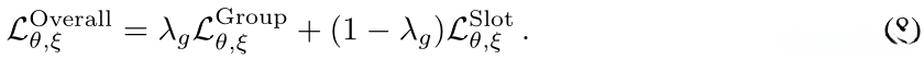 我们联合优化 语义分组目标 (方程 2)和 组级对比学习目标(方程 7),由平衡因子 λg 控制: