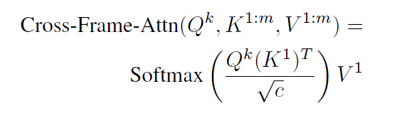 在text2video-zero架构中, 每个attention机制接收m个输入信号. 经过线性投影处理后, 生成m个对应的queries, keys以及values序列. 因此, cross-frame attention机制得以引入: