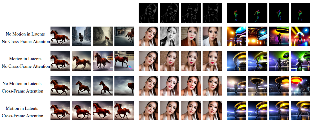 在上图的第一行中缺乏motion和cross-frame attention的概念支撑时,在生成图像的过程中出现了高度随机化的情况;这种情况下仅基于文本描述提供了语义信息而缺乏物体运动的一致性;为了改善这一现象