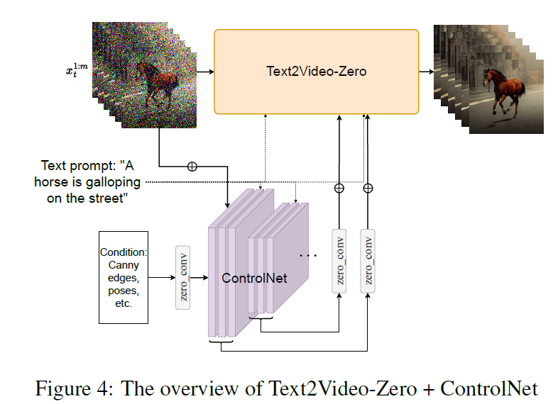 本文提出了一种名为Text2Video-Zero的方法,利用现有文本到图像扩散模型(如Stable Diffusion)实现零样本视频生成。该方法无需额外数据训练,在潜在码中引入运动动力学信息,并通过跨帧注意力机制保证前景对象的一致性与外观保留。其主要贡献包括:1. 在潜在码中编码运动动力学;2. 重新编程跨帧自注意力以保持对象外观一致性;3. 扩展至条件与内容专用视频生成及视频编辑任务。该方法结合ControlNet增强效果,并展示了完整的模型架构与流程图。