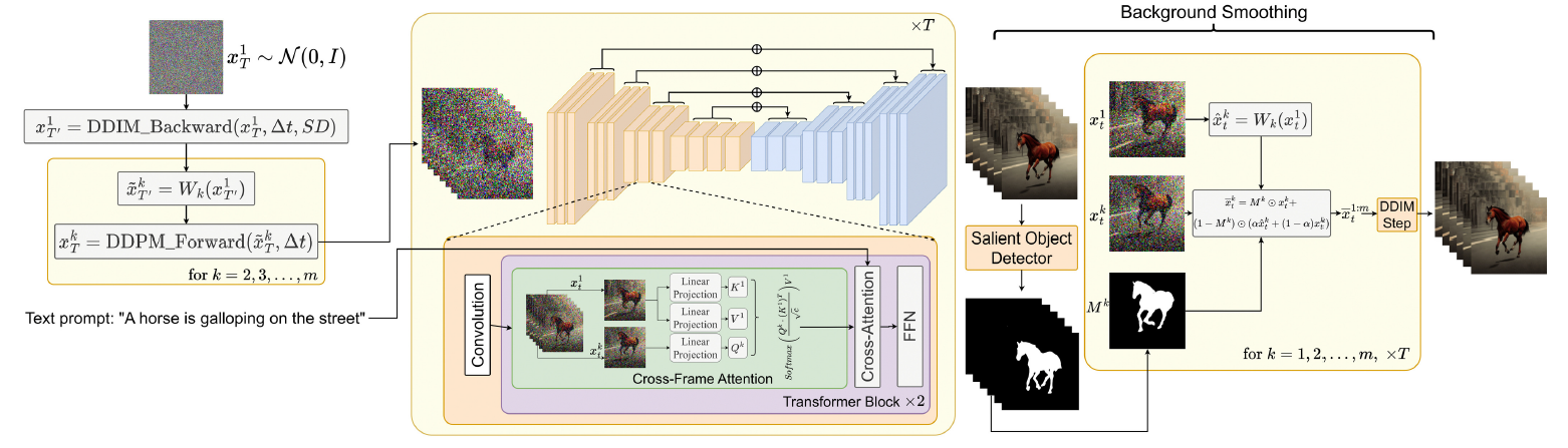 本文无需额外的数据训练即可实现现有文本到图像合成能力(例如Stable Diffusion框架),从而有效解决帧间不一致的问题。在具体实施中包含两个主要改进方向:首先通过引入运动动力学模型来丰富潜在编码信息(latent code),从而保证整体场景与背景的一致性;其次重构各帧之间的自注意力机制(self-attention),通过每个帧与初始帧之间的跨帧注意力机制来保留前景对象的内容、外观以及身份特征。该方法不仅适用于生成视频(Video Generation)领域,在条件或内容特定的视频生成模型(如pix2pix)以及引导式视频编辑等场景中也展现出良好的适用性。
