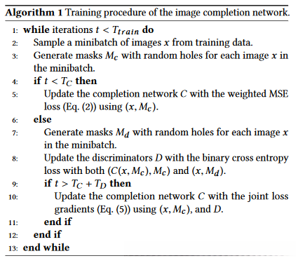 首先,在2016年发表的Context Encoders:Feature Learning by Impainting论文中,我参考了SATOSHI IIZUKA等人在2017年发表的Globally and Locally Consistent Image Completion工作的复现工作。该论文主要通过将上下文编码器的思想与GAN结合进行图像补全研究。具体而言,在该方法中上下文编码器是通过先对图像进行编码再解码的过程学习图像特征并生成待修补区域对应的预测图;而GAN则用于判断生成的图像是否为虚假图像。