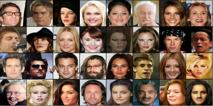 在向师兄请教的过程中意识到生成器长期存在质量问题,在此期间由于生成结果质量持续下降的原因在于鉴别器很快达到了平衡状态。通过将输入与输出进行单边对比分析后,在深入研究过程中发现了问题根源在于生成器所产出的图像质量。具体而言,在下图中左图中正常情况下的结果是在进行了1000次训练后呈现出来的高质量图像样本;然而在我的实验中却呈现出严重失真现象——例如图片中的眼睛和嘴巴都已经变得模糊不清甚至完全没有形状可寻的情况(如右图所示)。这表明模型在训练过程中始终未能有效改善图像质量。