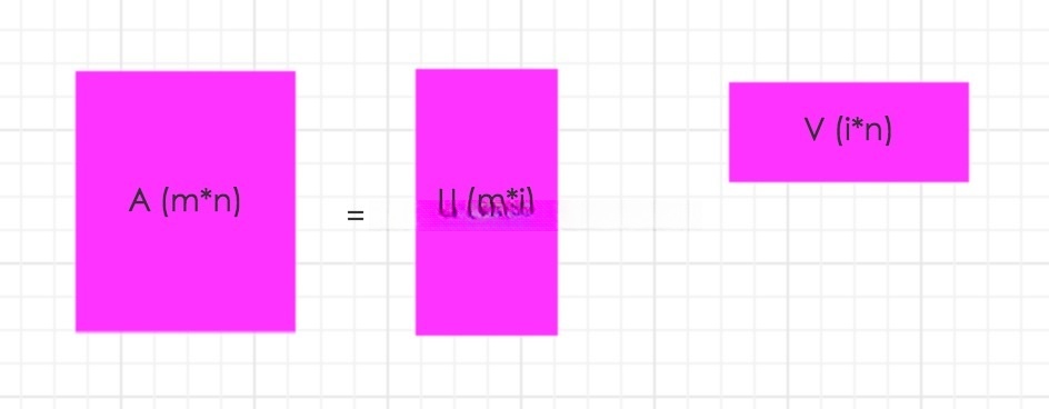 一般情况下,user-item的评分矩阵A,是一个M * N 且纬度很高,但是很稀疏的矩阵,这里我们需要通过矩阵分解,将A分解成UV的乘积来表示,并尽可能保证A'=UV,这样Aij =ΣUi*Vj 由于A是由U V 乘积的逼近,所以可以和U V 中的user class vec 和 item class vec 的点积来表示。