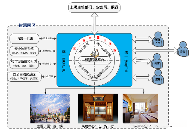 - 总体规划:从乐园的战略管理角度出发进行项目规划,在实现统一园区运营与智能集成监控的基础上构建服务支撑体系作为智慧园区总体规划的核心要素,并与乐园内各项软硬件系统实现有机整合与协同联动。具体包括物业管理系统、LED显示屏及多媒体展示系统等办公自动化设施;楼宇自控系统如电梯监控、空调控制及灯光控制设备;安全防范系统如防盗报警装置、电子巡更设备及生态停车场管理系统等。