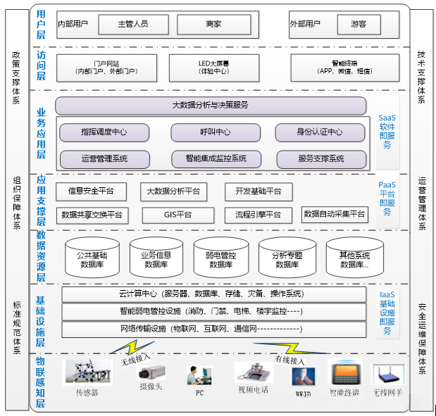 - 平台技术结构智慧化 :运用云计算、物联网、自动化控制、现代通讯、音视频、软硬件集成等技术,整合园区安防、消防、通讯网络、一卡通、信息发布、管网设备能源监控、停车管理、自动化办公等多个系统到一个统一的平台,实现各个系统的信息交互、信息共享、参数关联、联动互动,使得每个系统既可以独立运行、又保证数据和信息的互联互通,同时根据运营实际情况进行参数积累、习惯性分析报表等达到本平台技术结构的智慧化。