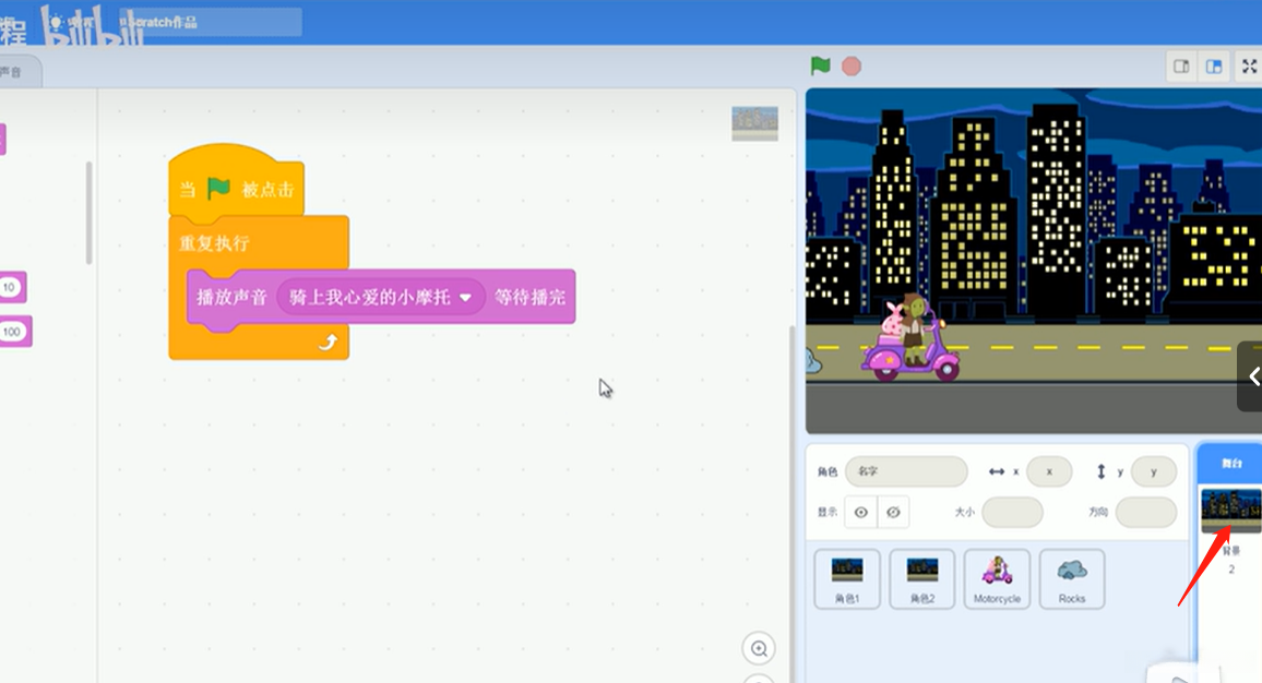 给背景添加背景音乐,背景音乐是自己上传的骑上我心爱的小摩托