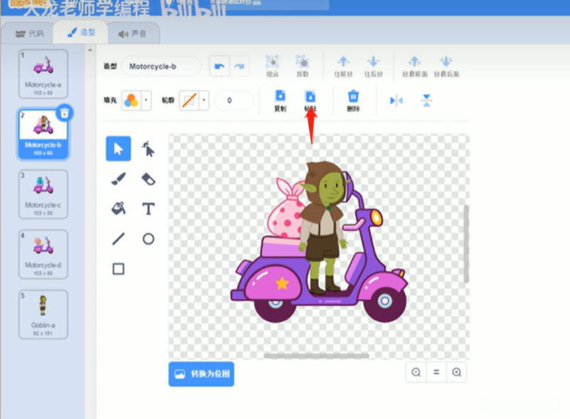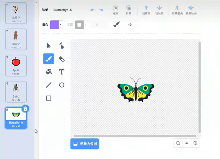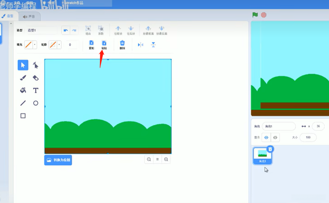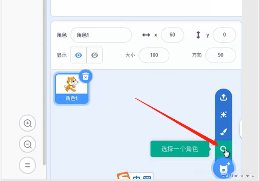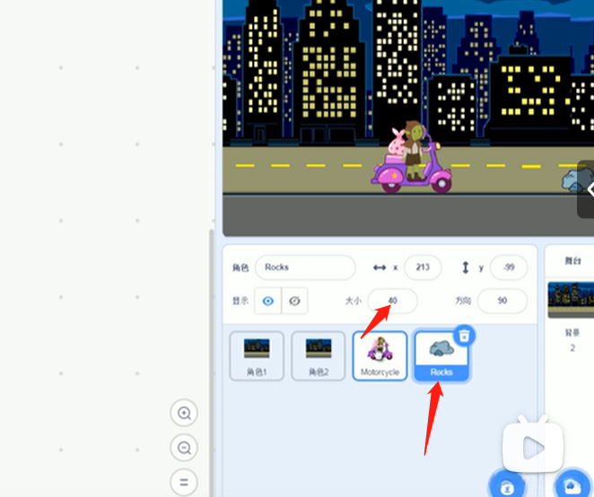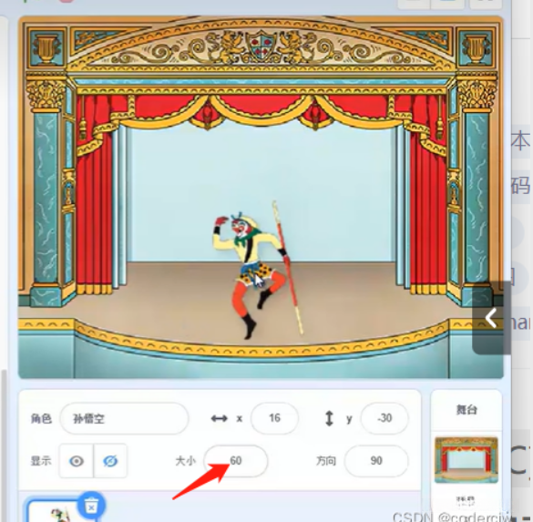 插入"孙悟空"这一角色,并插入一张背景图片。随后调整"孙悟空"的大小设置为60像素。请注意,在当前场景中并没有"孙悟空"这一角色可供使用,请选择任意其他角色来代替。