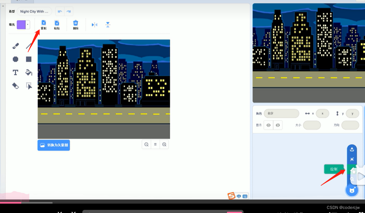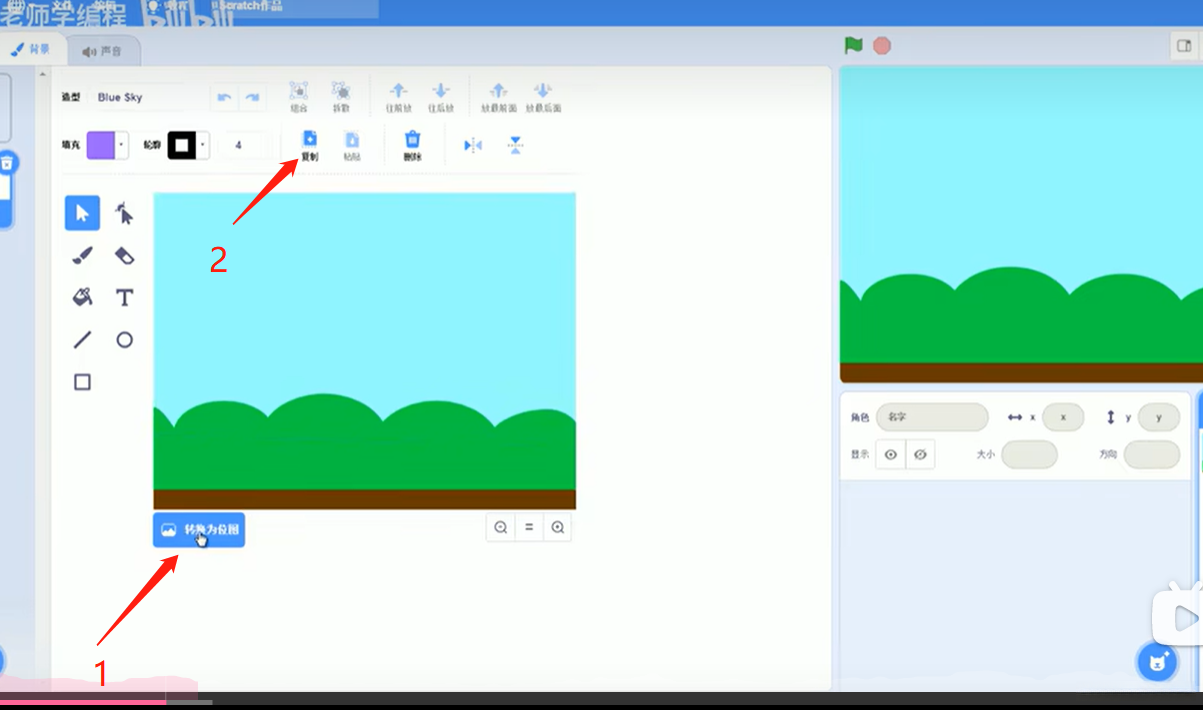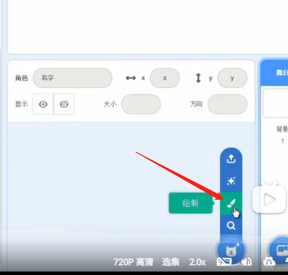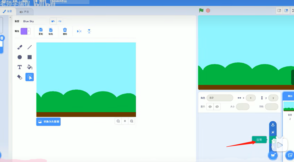 利用积木绘制人物并选择背景图进行填充。通过拖动人物到左下角并点击右下方的设置按钮来选择背景图。