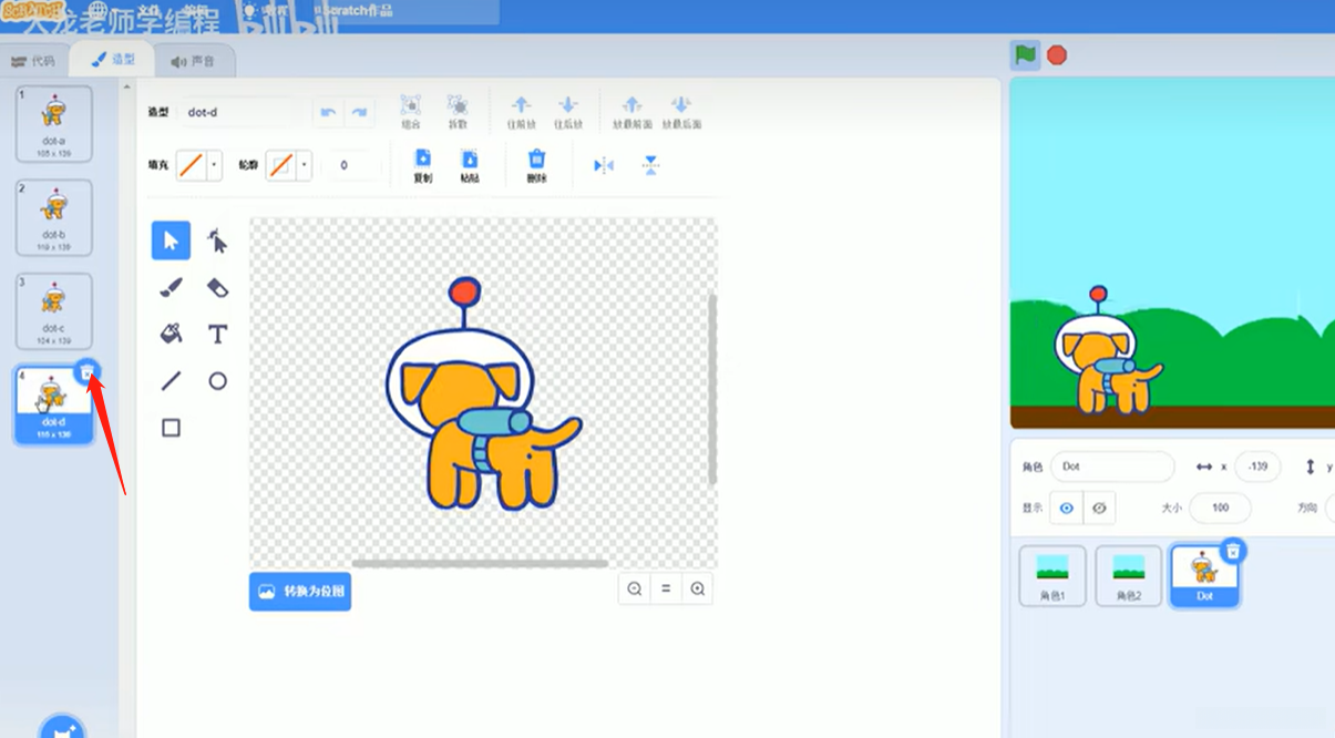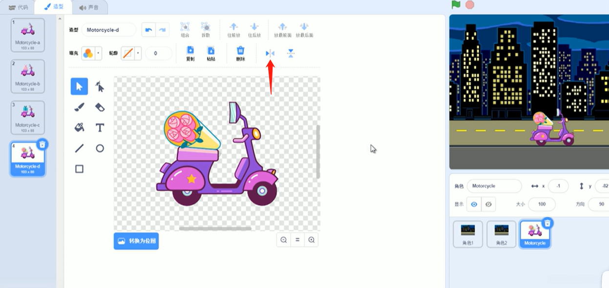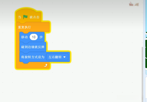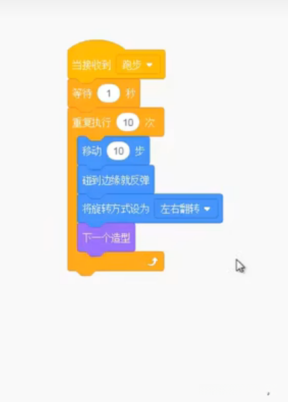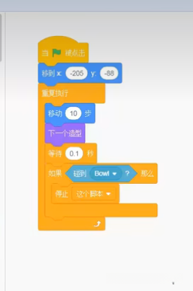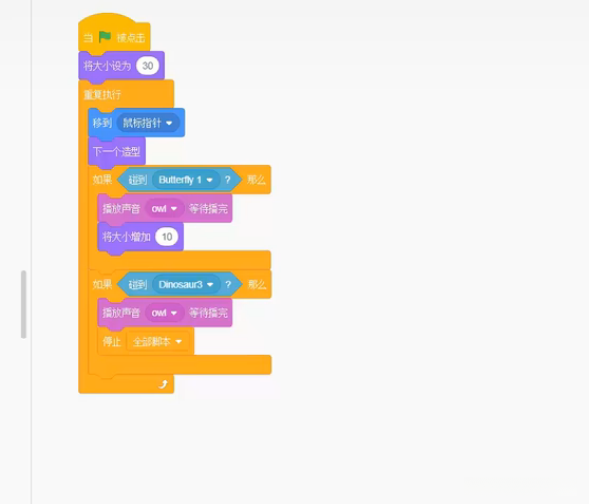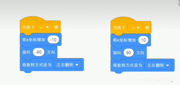 该代码实现了章鱼的自动行为模式切换功能。具体而言,当用户点击界面右侧方向键时,系统将触发动作序列,使得虚拟角色呈现出形状d并向右侧水平方向平移10个单位长度;而当用户按下左侧方向键时,虚拟角色将切换为形状c并向左侧水平方向平移同样的距离幅度。