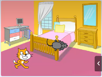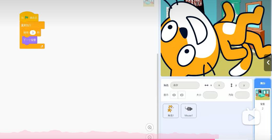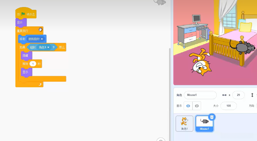 小猫会随机选择方向移动或改变造型以捕捉老鼠,并让用户手动控制小老鼠的位置或速度。
