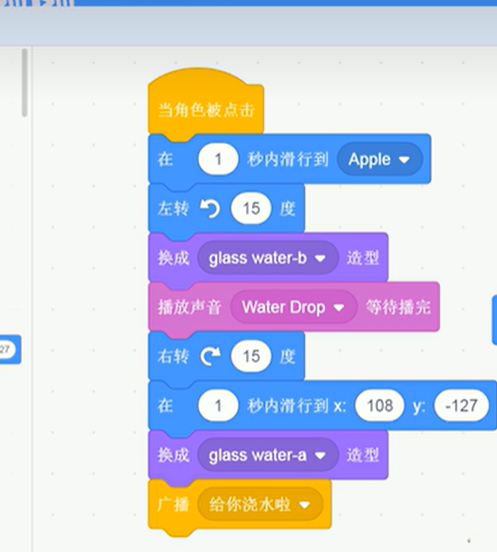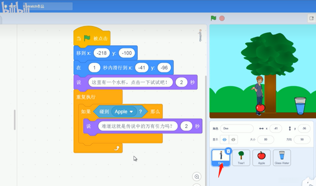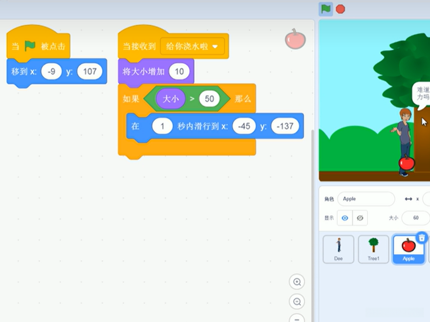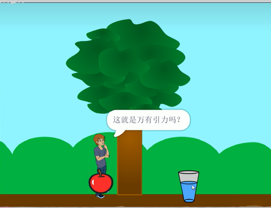 需求描述:点击水杯,给苹果浇水3次,苹果掉下来,