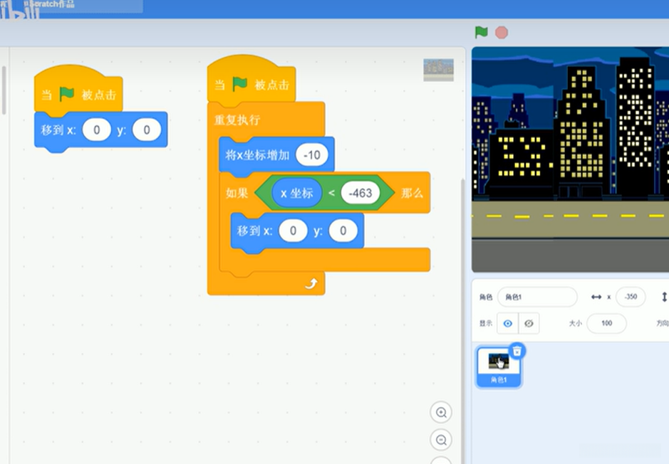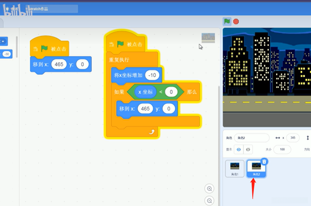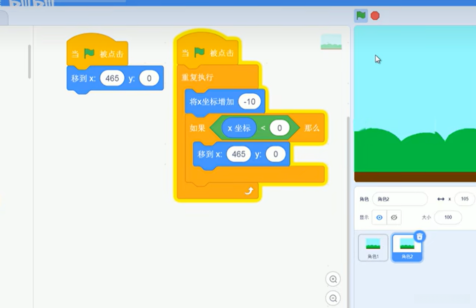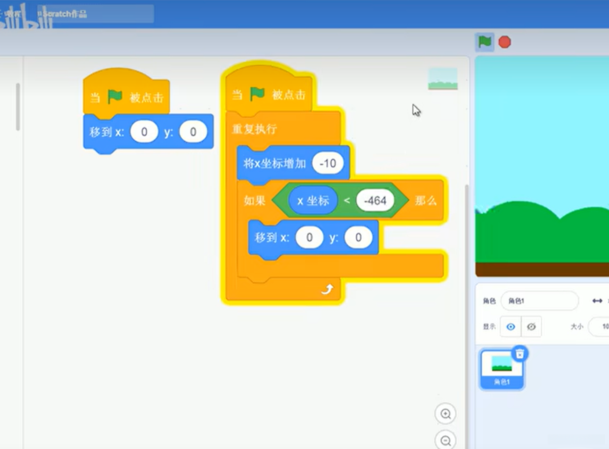 角色1的代码:当x坐标小于-464时,则表示角色1已处于画面左侧边缘位置(即-465处),因此在到达该位置后会自动返回至画面中心位置。