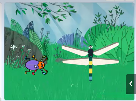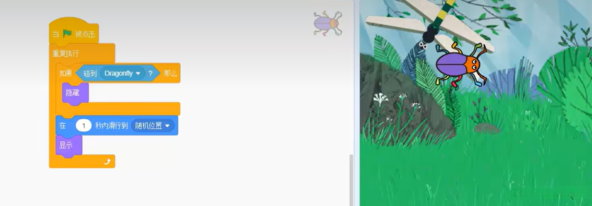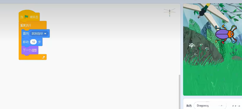 需求描述:蜻蜓随鼠标移动, 甲虫受控移动, 在接触瞬间释放求食的鸣叫.