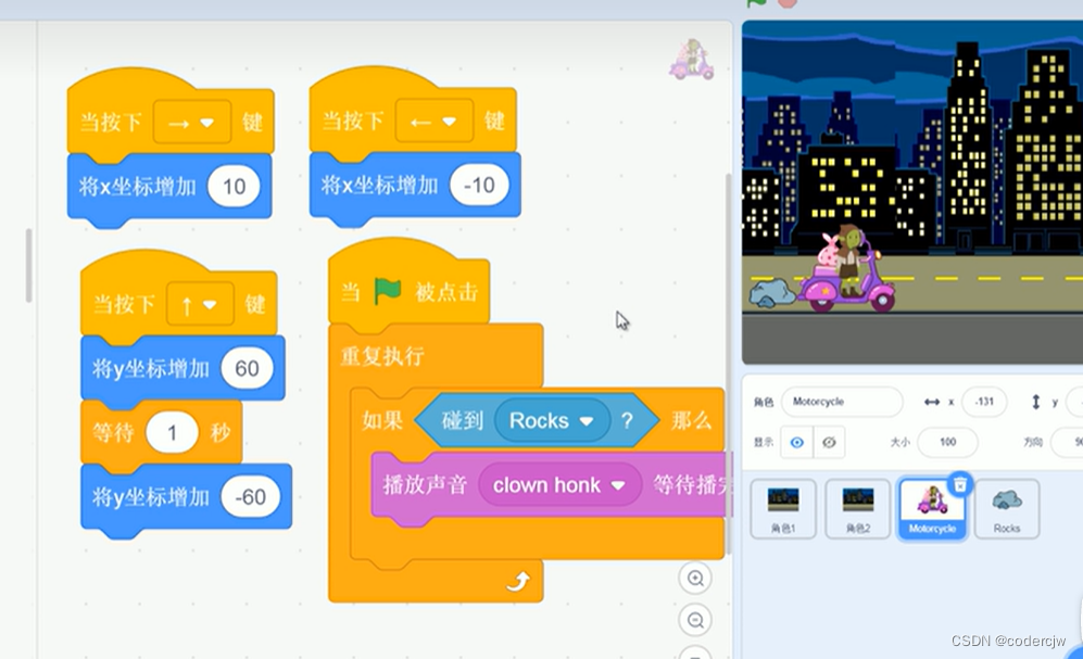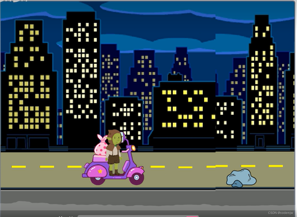 需求描述:背景移动,小摩托上下移动躲避岩石