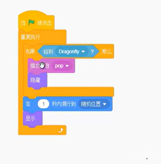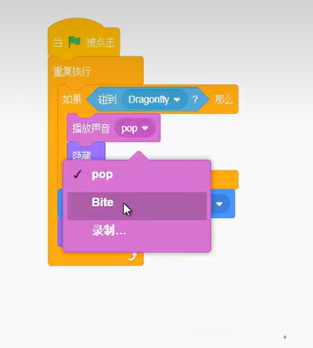 当甲虫碰到蜻蜓,就要出现甲虫被吃掉的声音,加入一个播放声音,
