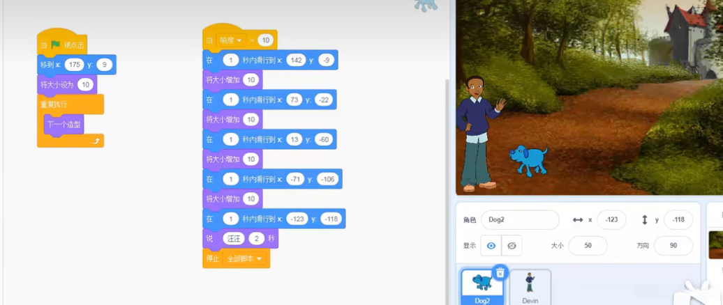 需求描述:当小男孩说出哈哈过来,小狗就从远处过来了