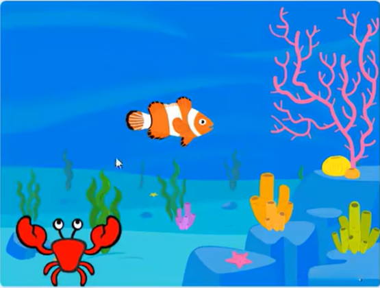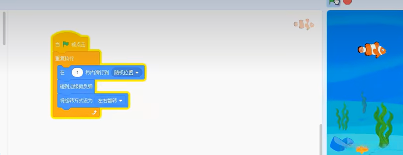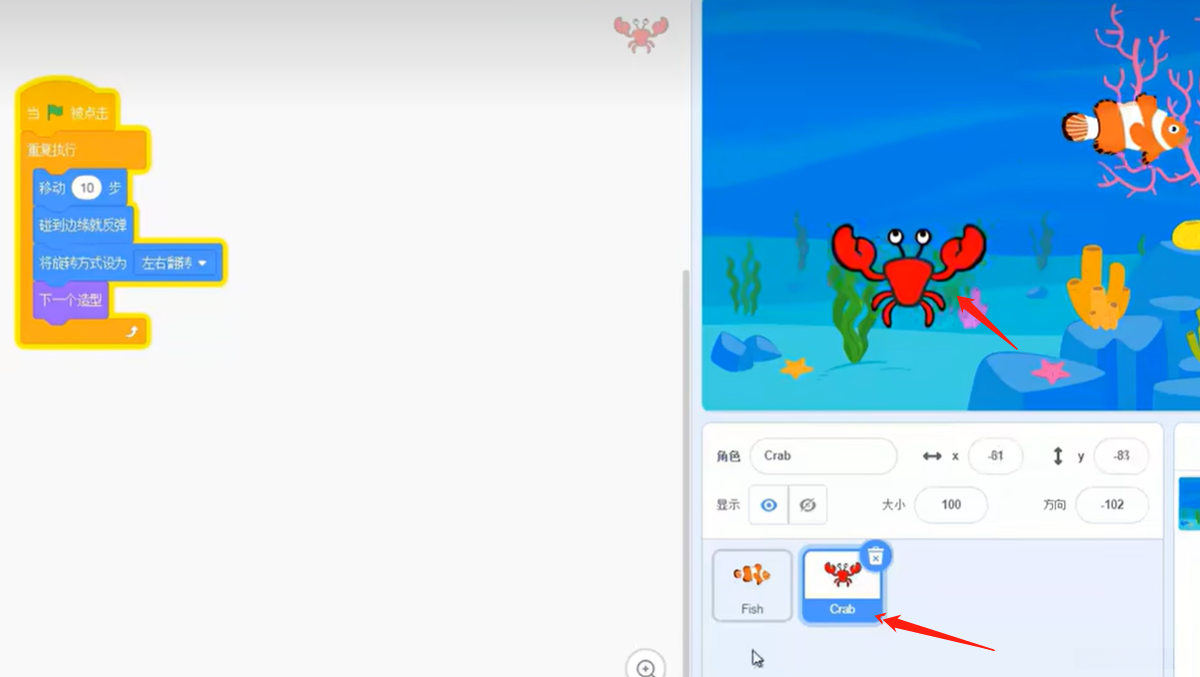 点击运行,小🐟和螃蟹就可以移动了,螃蟹能斜着移动是因为方向设置为78