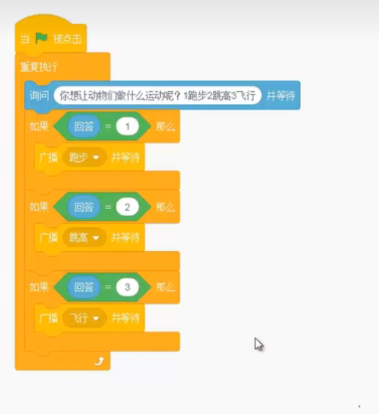 用户点击扩展积木模块中的画笔模块依次完成不同动物的奔跑动作。