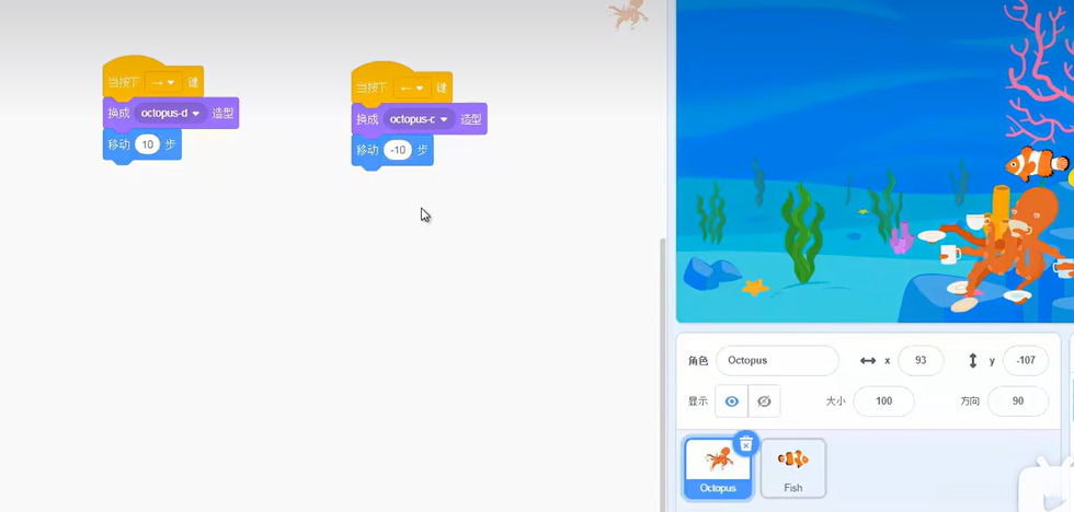 小鱼呈现随机运动模式,在右方向按钮被触发时,章鱼切换为造型d,并向右方平移10个单位,在左方向按钮被触发时,则切换为造型c并相应地向左方平移10个单位。