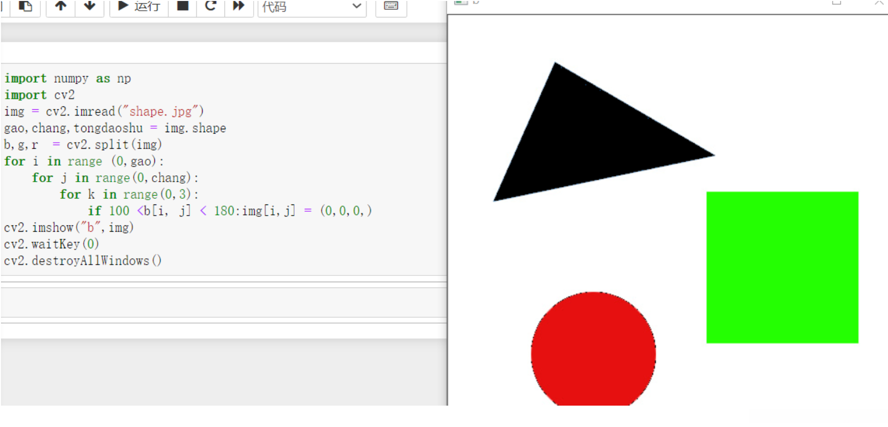 任务:首先将图片下载,保存为shape.jpg,编程使得图片中的蓝色三角形改变成黑色,代码与结果截图上传。