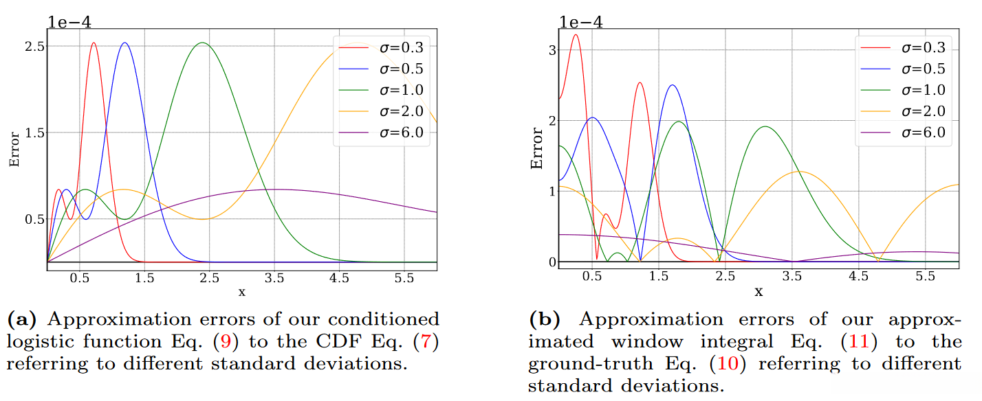 Error Analysis of using our conditioned logistic function to approximate CDF of Gaussian signals and window integration. Note that the scaling factor of the error is
