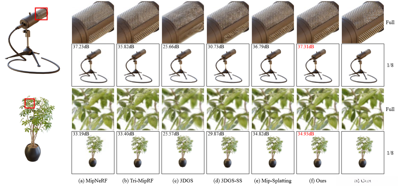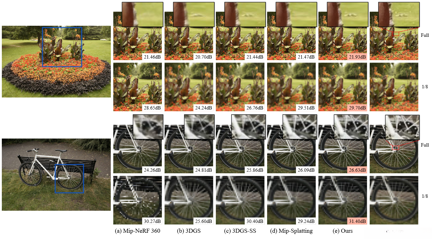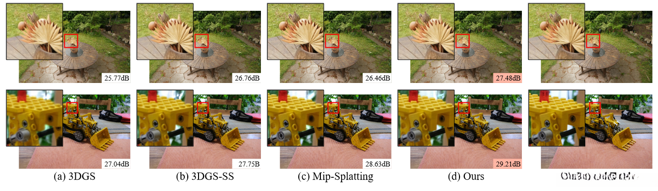 All methods are trained on images with downsampling rates covering**[1, 2, 4, 8]**. Our method can better overcome the artifacts in 3DGS with better fidelity of details.