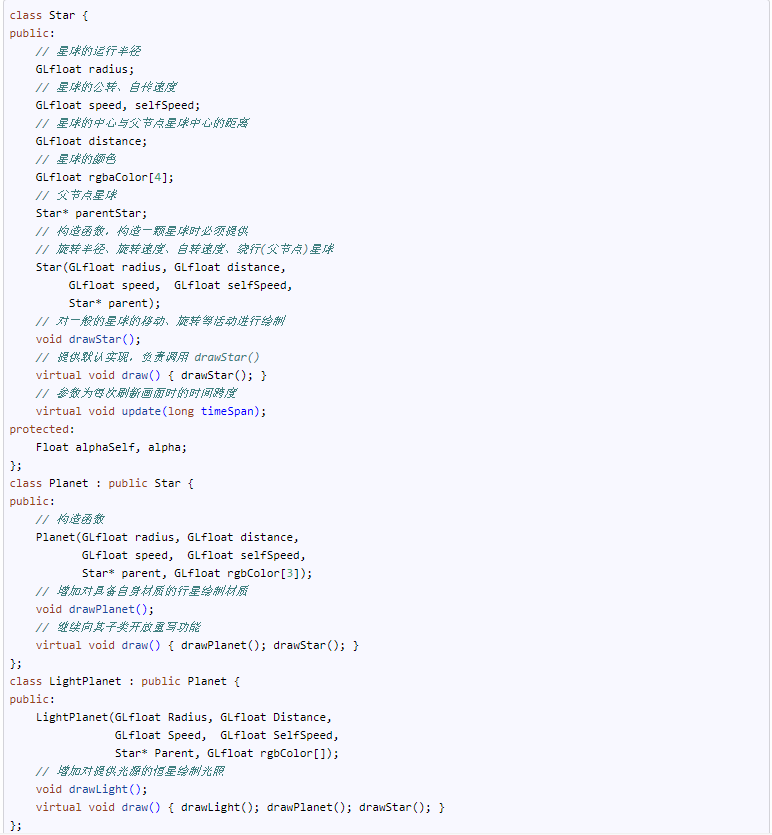 整个天体系统中,他们都是一颗星球(Star),区别行星和恒星只需要通过它们是否具有父节点即可;其次,对于不同的星球而言,它们通常具有自身的材质,并且不同的材质会表现出自身是否发光,由此我们有了初步的对象模型。故我们将星球分为:普通能够自转并绕某个点公转的星球(Star), 具有特殊材质的星球(Planet), 能够发光的星球(LightPlanet)。