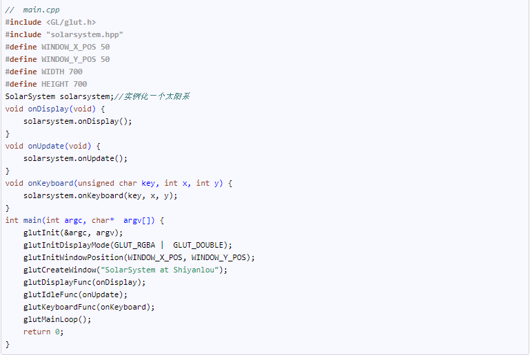 项目简介:使用 C++实现 OpenGL GLUT 实现一个简单的太阳系行星系统,将涉及一些三维图形技术的数学基础、OpenGL 里的三维坐标系、OpenGL 里的光照模型、GLUT 的键盘事件处理。