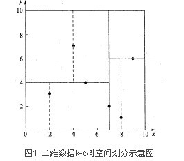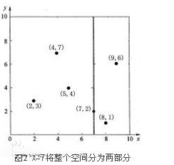 分割超平面x = 7将整个空间分为两部分,如图2所示。x < = 7的部分为左子空间,包含3个节点{(2,3),(5,4),(4,7)};另一部分为右子空间,包含2个节点{(9,6),(8,1)}。