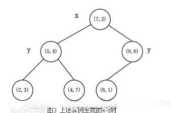 然后对左子空间和右子空间内的数据重复根节点的过程就可以得到下一级子节点(5,4)和(9,6)(也就是 左右子空间的'根'节点),同时将空间和数据集进一步细分。如此反复直到空间中只包含一个数据点,如图1所示。最后生成的k-d树如图3所示。
