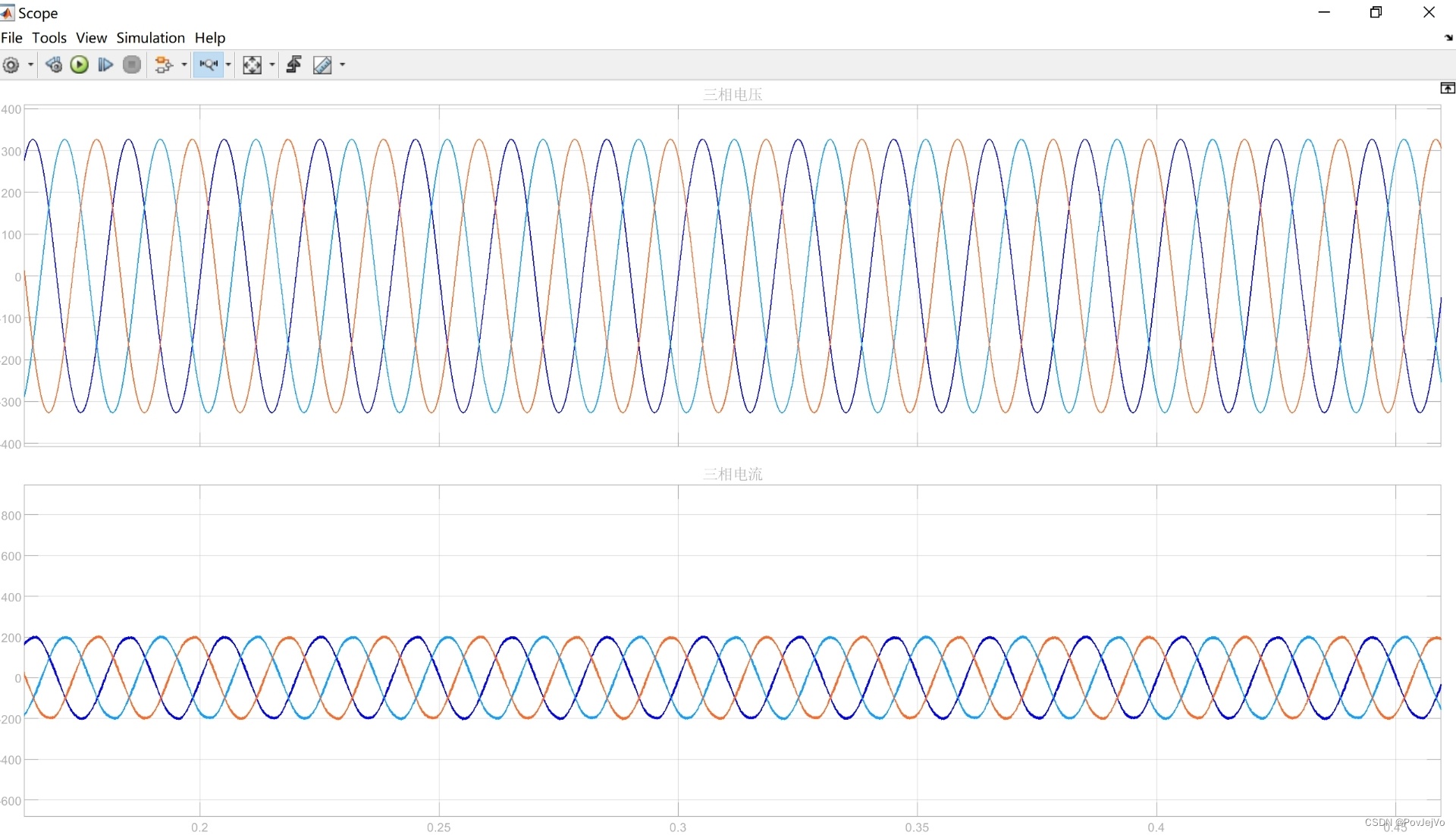 基于MATLAB进行仿真研究发现,在光伏系统中采用三相并网逆变器方案能够有效实现各功能模块的基本运行需求。该系统经过优化设计后,在与三个额定电压为380V的电网电源同步配接下完成了逆变输出任务,并维持了稳定的直流母线电压(维持在600伏特),其中d轴电压维持在311伏特、q轴电压则稳定为零伏特;此外该系统还具备良好的有功功率输出性能