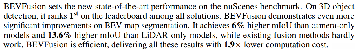 BEVFusion在精度方面显著超越了单独使用 camera 或者 LiDARs 的方案,在计算开销上显著降低的同时,运行效率得到了显著提升。