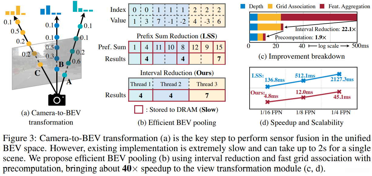 Interval Reduction:通过提升特征聚合的速度,我们开发了一个专用的GPU内核,在BEV网格上实现了高效的并行计算:为每个网格分配一个独立的GPU线程,并对其区间进行求和后立即写入结果。这种设计去除了数据间的依赖关系(无需多级树结构的数据缩减),从而优化了存储操作,并将特征聚合过程的时间复杂度从500ms缩短至2ms。