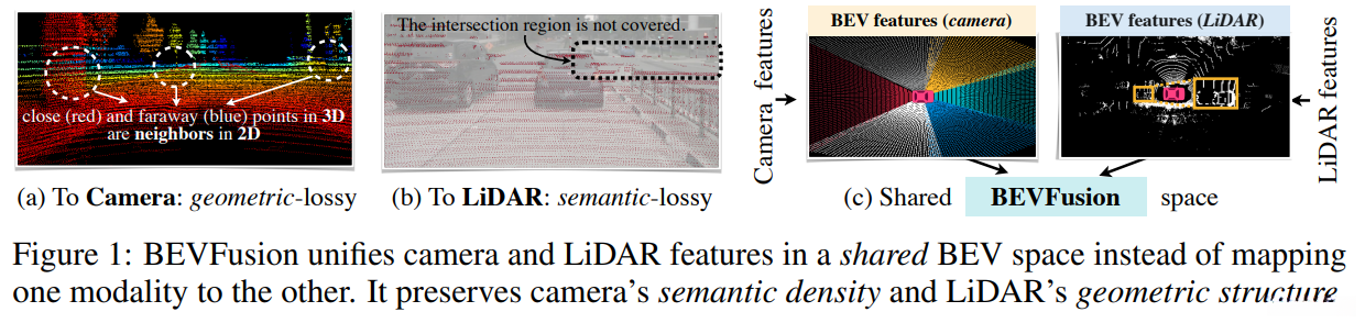 在图c中开发了一种名为BEVFusion的技术,在同一个综合视图中整合多种模态特征(BEV),不仅保留了良好的几何结构与丰富的语义信息,并且能够广泛应用于多种3D感知场景。