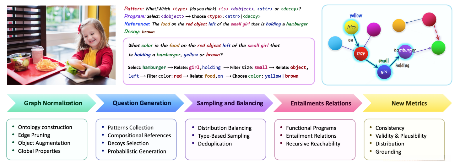 为了解决这些缺点,同时保留真实世界图像的视觉和语义丰富性,我们引入了GQA,一个用于视觉推理和复合问题回答的新数据集。我们开发并精心完善了一个强大的问题引擎,利用内容 :通过视觉基因组场景图[20]提供的关于对象、属性和关系的信息 ,以及结构 :一种新创建的广泛的语言语法,它耦合了数百种结构模式 和详细的词汇语义资源 。在我们的引擎中,它们组合在一起生成了超过2200万个新颖而多样的问题,这些问题都以功能程序的形式提供结构化表示 ,这些功能程序指定了它们的内容和语义 ,并且在视觉上以图像场景图为基础。