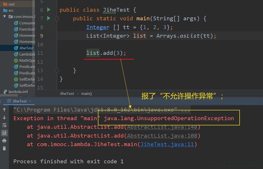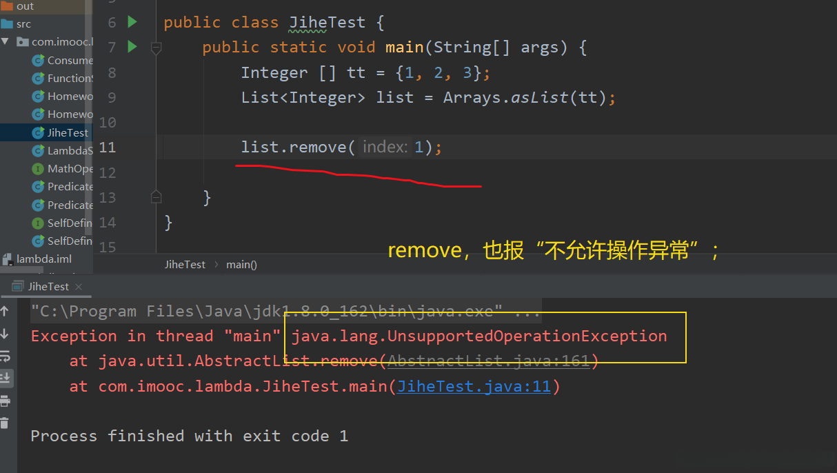 当我运行这段代码时,遇到了一个 java.lang.UnsupportedOperationException 异常。这个错误提示显示,在列表对象myList中添加新项是不允许的;同样地,在试图从myList中删除项时也会触发相同的错误。那么原因何在呢?请参考官方文档中的相关内容。其中一段描述指出: