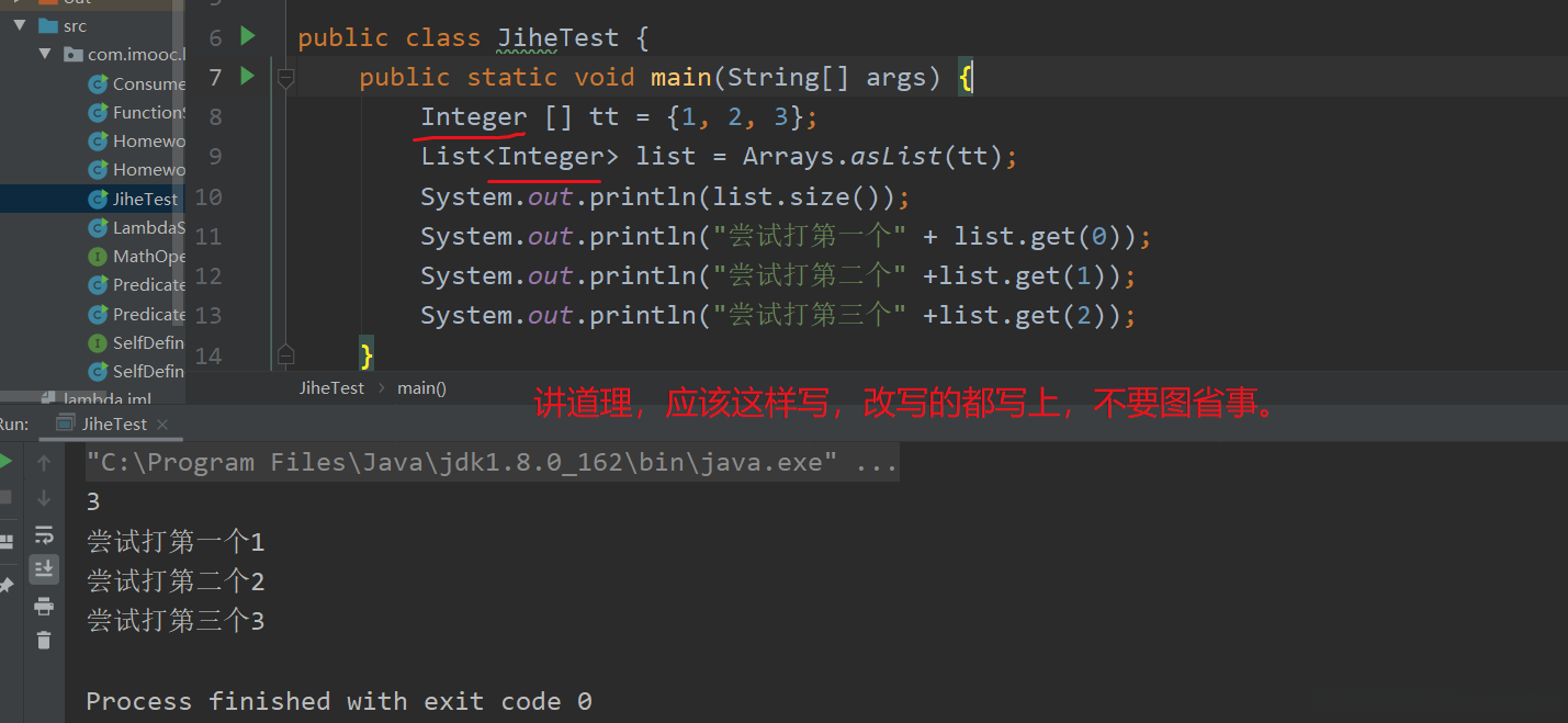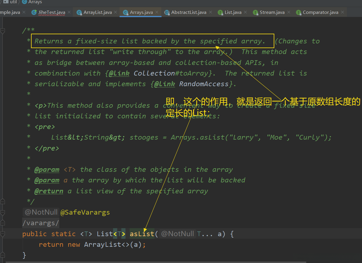 请确认:参数类型为 T ,依据官方文档的相关说明可知,T 代表数组元素所属的 class 类型。对于熟悉反射技术的朋友来说,请明确 class 的概念应该是显而易见的。任意类型的对象都具备 class 属性这一事实是不容置疑的。如 int、short、long 这样的基本数据类型不具备 class 属性,请注意区分其与包装类 Integer、Short 等的区别。具有 class 属性的是它们所对应的包装类 Integer、Short、Long 等等(注:此处应包含具体实例)。因此,在使用 asList 方法时必须确保传入的对象或对象数组才能正常工作——如果传入的是原始数据类型而非包装类数组,则会导致 List 实际接收的对象仅为整个数组本身!这正是为什么要引入包装类的原因之一——它们能够更好地支持对象操作功能并提供必要的属性支持(注:此处应包含具体示例)。当传入一个由原始数据类型组成的数组时(asList 方法会收到这样的参数),则 List 实际接收的对象仅为整个输入数组本身!这正是为何必须确保传入参数为对象或对象数组的根本原因(注:此处应包含具体示例)。因此,在实际应用中应当避免将原始数据类型作为asList方法的输入参数——这将导致 List 结构无法正确解析输入中的单个元素信息!
