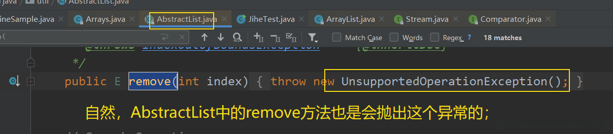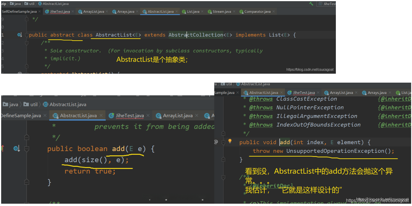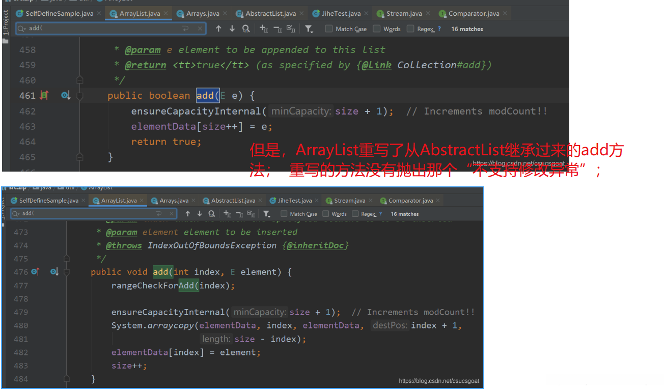 我可以去AbstractList类中进行考察:可以看出该add方法会触发"UnsupportedOperationException"异常;
