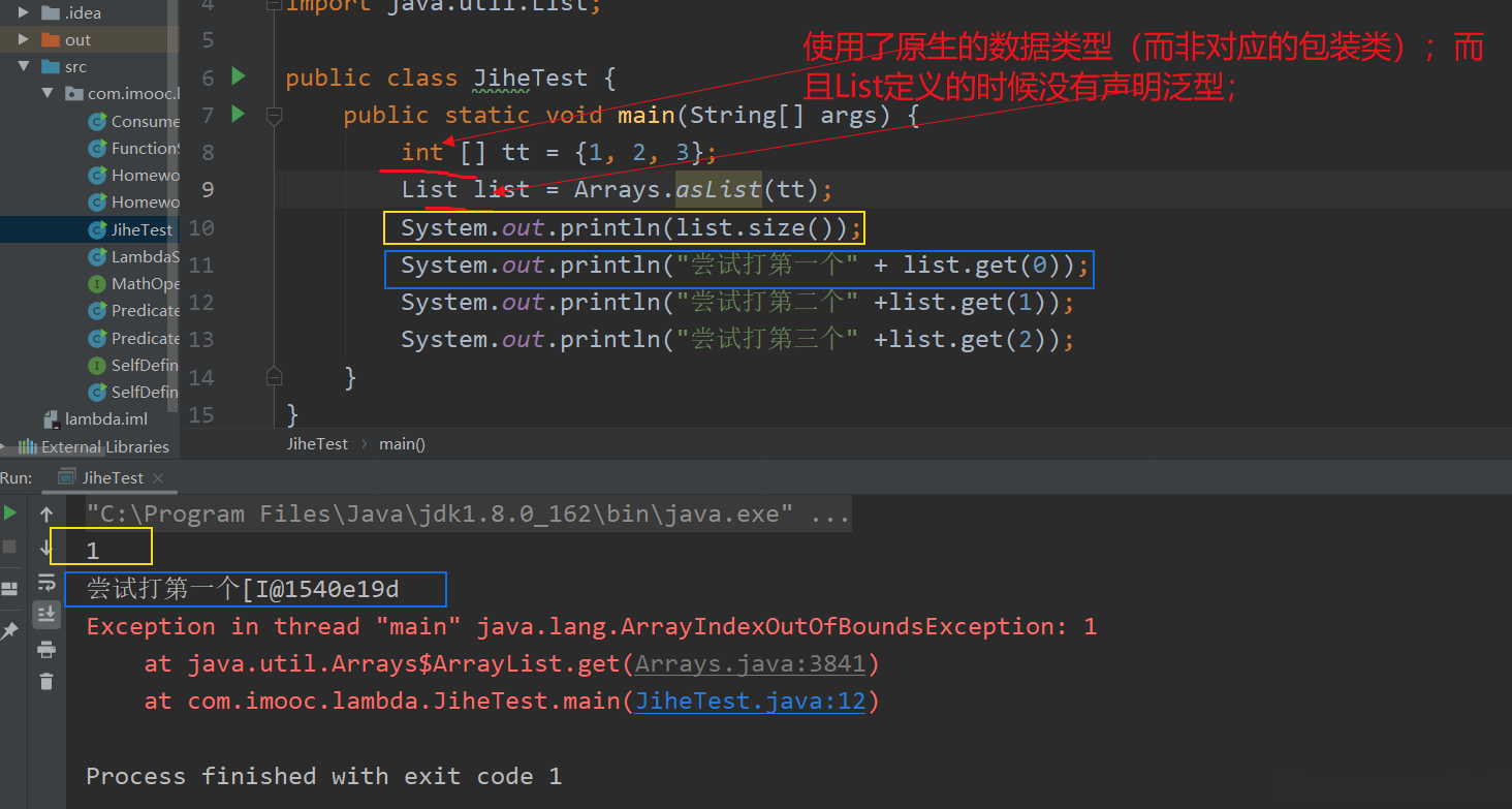 错误点1: 将原生类型的数组作为参数,而且List定义的时候没有使用泛型