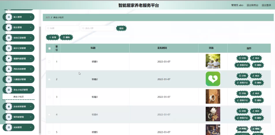 养生小知识管理;位于养生小知识管理页面的操作包括显示详细信息、编辑内容以及查看评论和删除内容等功能。