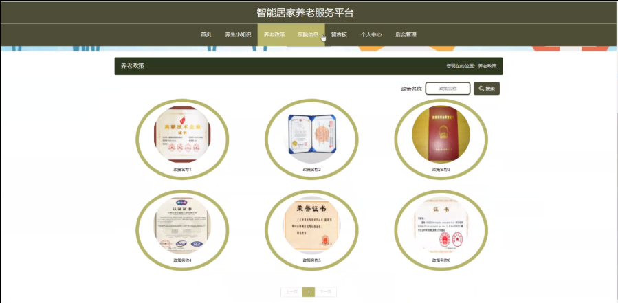 养老政策;在养老政策页面可以查看政策名称,政策内容等内容,如图5-6所示。