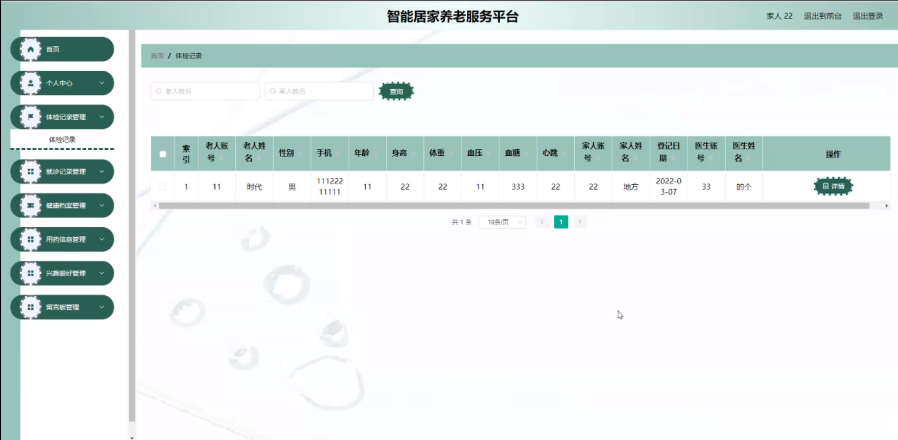 体检管理系统中,在体检记录页面可实现对老年人信息档案、基本信息以及健康数据的具体查看与管理。