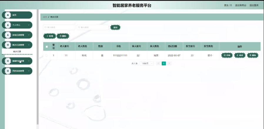 就诊记录管理系统;在就诊记录管理页面中可对老人账号及其相关信息(如老人姓名信息、性别、手机号码等)以及家属账号及其相关信息(如家属姓名信息)进行详情查看、修改以及删除操作,请参考图5-19